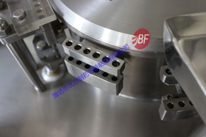 2、采用加大工作臺(tái)面,保證了該機(jī)運(yùn)行的穩(wěn)定性(工作臺(tái)面比其他廠家工作臺(tái)面大90mm)。所有與藥物接觸部分均采用不銹鋼,與藥粉接觸部分零部件(1)、計(jì)量盤(pán)SUS316L;(2)、充填桿SUS316L;(3)、上、下模塊SUS316L;(4)、料斗SUS304;(5)、刮粉器、刮粉刀SUS304;(6)、密封圈等SUS316L。
